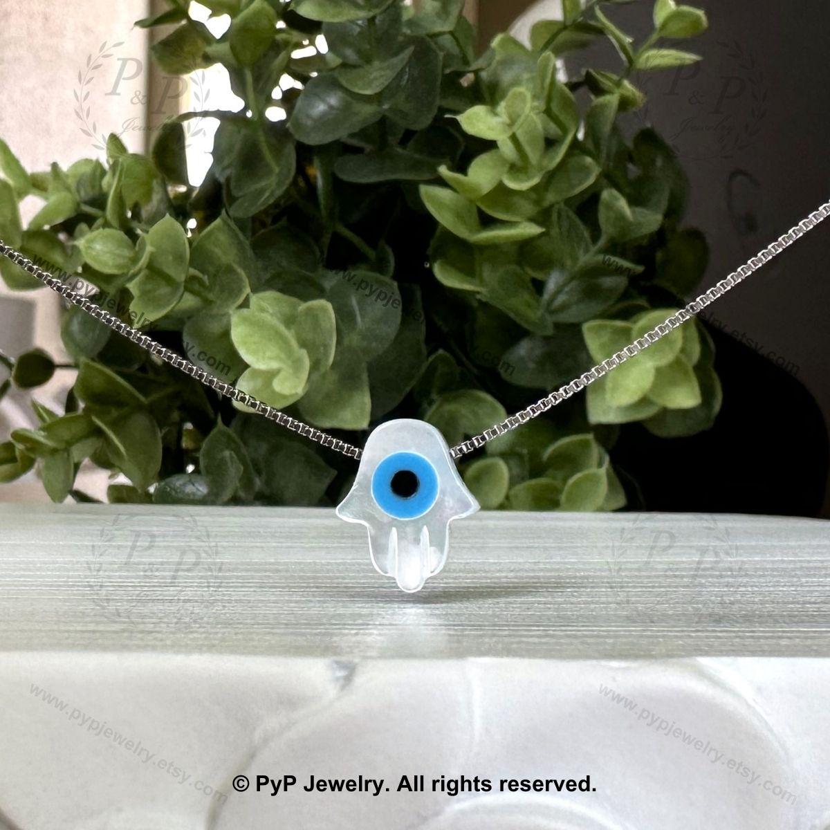 This Hamsa Necklace makes a meaningful gift for a special loved one. The natural glow of mother of pearl combined with the symbolic evil eye creates a delicate yet powerful design that complements any jewelry collection. It can be worn alone for a minimalist look or layered with other necklaces for a refined and elegant style.