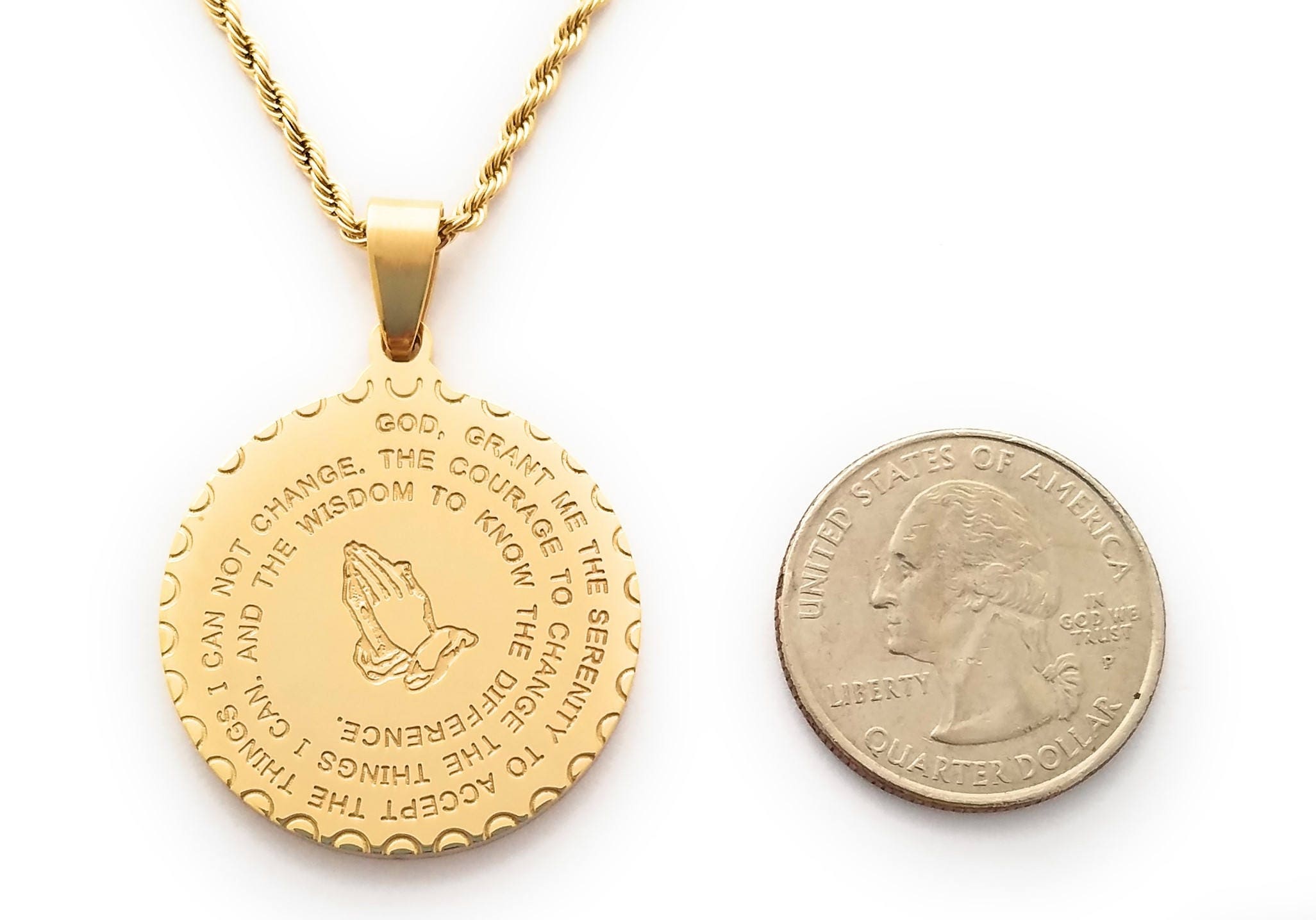 Stainless Steel Coin Charm Pendant with Gold Plated inscribed with The Lord's Prayer on one side and Praying Hands with Serenity Prayer on the other.